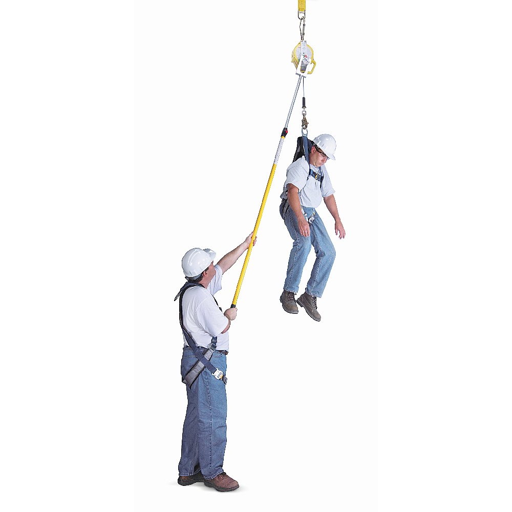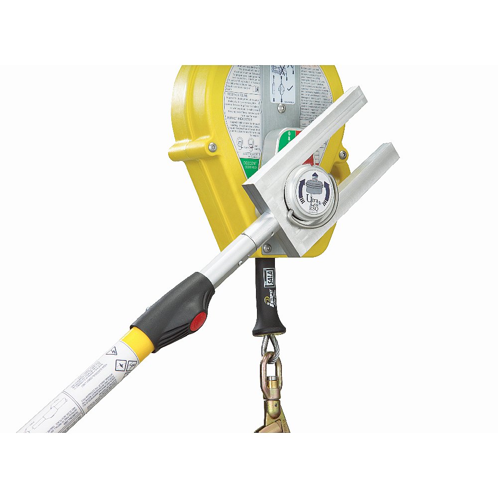 Fallskyddsblock med räddningsfunktion med 2 lägen. Låsning - Automatisk nedfirning / Låsning - Manuell start av nedfirning med hjälp av teleskopstång.