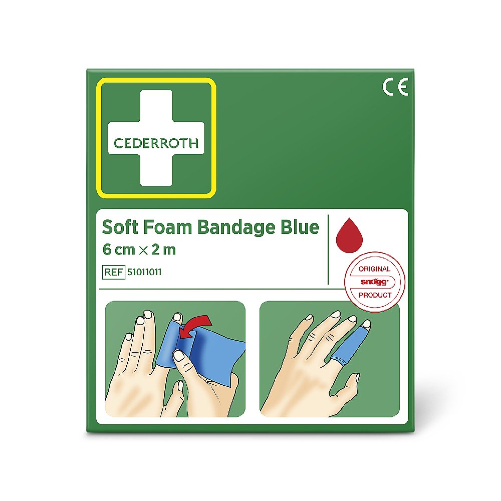 Cederroth Soft Foam Bandage Blue 6 cm x 2 m fungerar både som plåster och som bandage. Förbandet passar på alla typer av små sår oberoende av värme, kyla, vått eller torrt och sitter kvar även i vatten. Cederroth Soft Foam Bandage är ett självhäftande limfritt plåster och klibbar därför inte fast i hud eller hår. Riv enkelt av en passande bit och linda runt det skadade området. Vid kraftig blödning forma en bit Soft Foam Bandage som en ”kudde” för att skapa ett tryckförband. Cederroth Soft Foam Bandage är idealiskt för snabb och enkel sårvård. Passar som refill till Cederroth First Aid & Burn Station