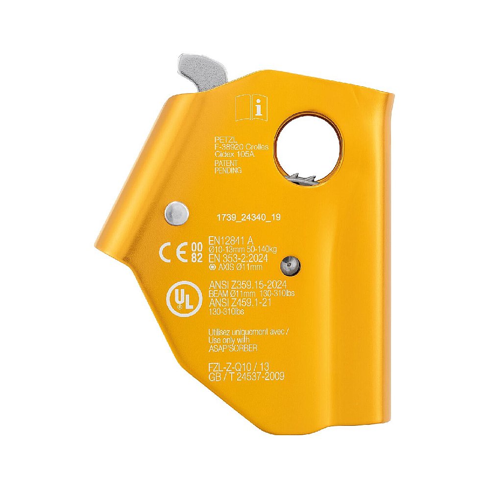 CE EN 353-2 vid användning med en ASAP’SORBER 20/40 eller ASAP’SORBER AXESS energiabsorberare, en AXIS 11 mm rep med två sydda avslutningar och en OK TRIACT-LOCK karbinhake.