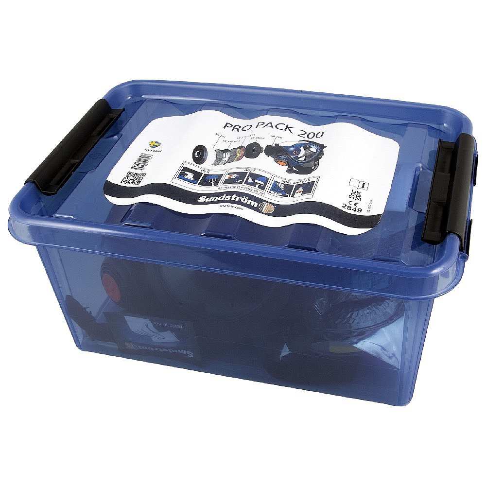 Helmask SR 200 med PC-visir / filteradapter SR 280-3 / partikelfilter SR 510 P3 R / gasfilter SR 315 ABE1 / förfilter SR 221 / förfilterhållare / rengöringsservett / förvaringsbox SR 344.